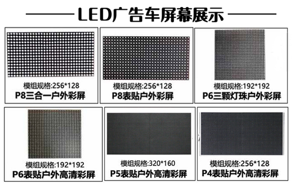 廣告車選裝配置:客戶可根據需求選裝屏幕清晰度(P10彩屏、P8彩屏、P6彩屏、P5彩屏、P4彩屏)、單面彩屏、
